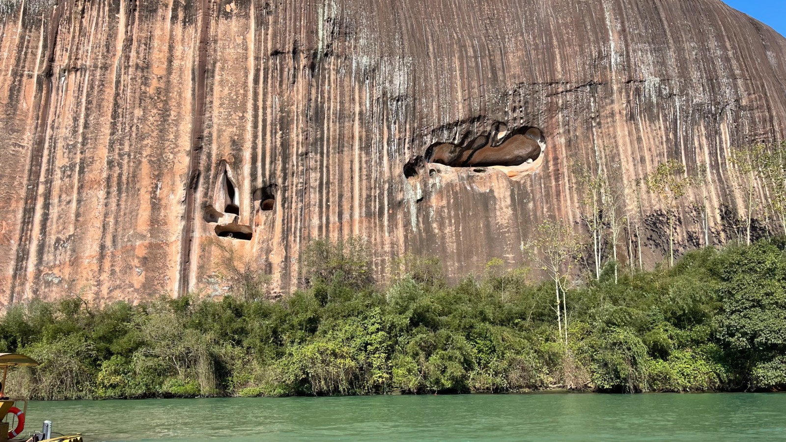 竹筏船沿著光滑壯麗的巖石山緩緩而行,水上丹霞的絕美風(fēng)光如同一幅徐徐展開的長卷,在我們眼前一一呈現(xiàn)。
